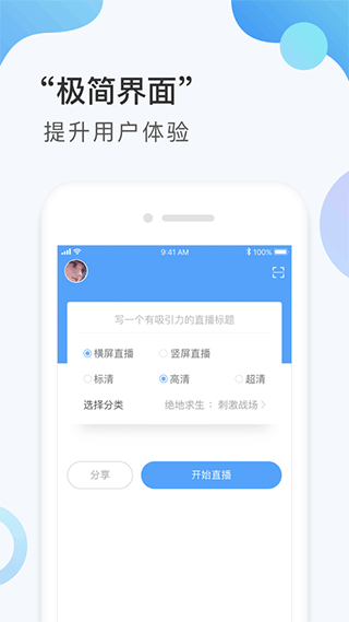 ⑥直播设置。选择直播类型、横竖屏以及清晰度