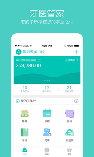 牙医管家ios版是一款由国内知名牙科管理专家团队研发设计的口腔诊所一站式管理平台,基于口腔生态云平台技术,软件针对诊所客户流失率高、工作人员效率低、信息易泄露、运营成本高、业绩难考核等当下私人口腔诊所的痛点,提供管理、营销、采购、统计、收费处置等一站式解决方案。让您轻松工作,有效管理。