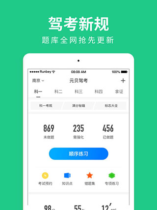 元贝驾考ipad版是由南京元贝信息技术有限公司独立研发的一款功能强大的驾校考试管理软件,也是网易教育金翼奖年度最受用户喜欢的手机程序。它具有十余年驾培专业经验,可提供小车、货车、客车、摩托车等全车型及网约车资格证考试真题,已帮助千万学员顺利通过驾照考试。软件首发多城市小车C1C2新规地方题库,并特邀资深试题专家撰写考题分析,轻松讲解考点难点知识点,让用户从择校报名到考试拿证全程轻松搞定,再也不做“马路杀手”,欢迎需要学车的小伙伴免费下载。