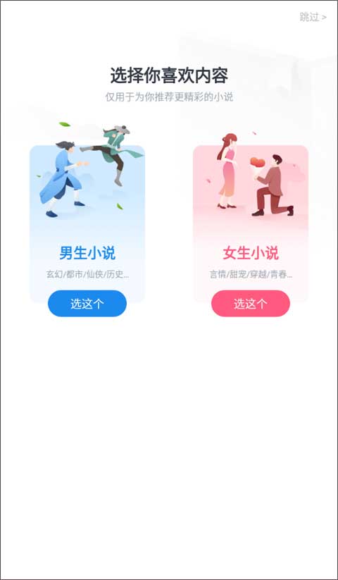1、打开软件之后就会选择你的性别,它会根据你的性别来推荐你喜欢的内容,像男生就会推荐玄幻、都市、仙侠等小说;而女生则会提供言情、甜宠、穿越、青春等书籍。