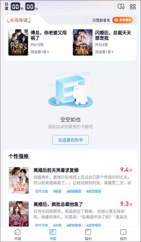 3、书架则会显示你添加好想要阅读的书籍,选择你喜欢的排版模式和阅读模式开始挑选书籍。