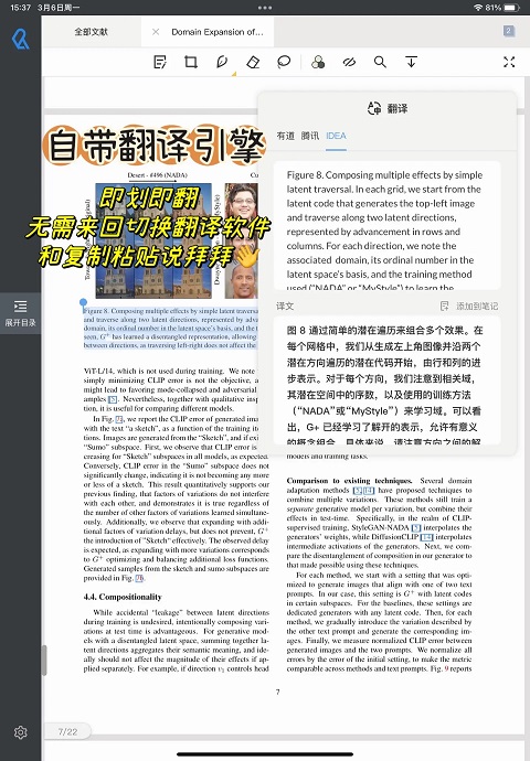 ReadPaper平板iPad客户端是一款集专业翻译、文献管理、手写笔记、智能阅读于一体的AI科研神器,以往对于科研或从事学术论文的朋友来说,翻译需要参考不同翻译软件,来回切换甚是麻烦,现在有了它不仅能帮你翻译大量文献,而且不同针对不同应用场景的需求,提供不同功能的翻译选择,如全文翻译、划线翻译等等,云端同步操作,支持Windows、Mac以及网页端同步操作,甚至还支持离线阅览。