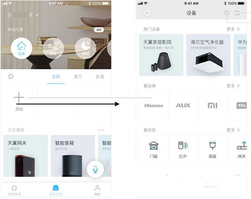 1)没有设备可点击“+”按钮添加设备。添加设备页面共包含设备搜索、扫码添加、热门设备、看品牌及看类型添加设备。