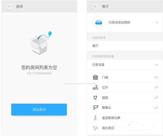 1、添加房间:若还没有添加房间,可点击左侧的“按钮添加房间,为房间添加图标和命名,以及为该房间添加设备。
