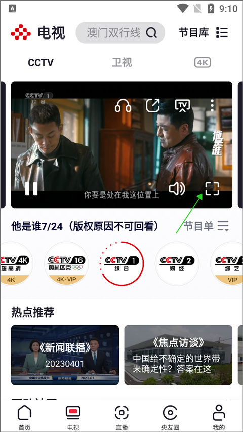 3、如果是想要回放电视直播画面,可以点击电视直播画面后点击右下角出现的全屏图标(下图绿色箭头所指)