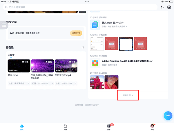 1、在百度网盘首页内找到最近播放记录并点击查看全部