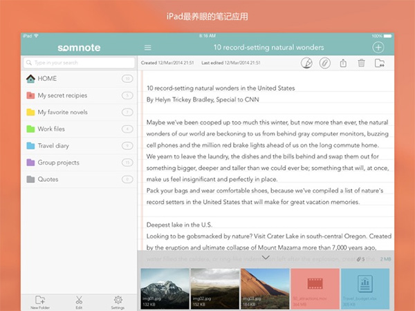 棉花笔记ipad版是专门为苹果用户独家设计的记事本软件,可通过该软件书写自己的个人笔记或者记录生活中的趣闻趣事等等。提供了更改字体、添加图片、文件备份等实用功能,保存文档的速度上也非常快,不会浪费用户一点时间,适用于经常记录事情和书写日记的朋友使用。