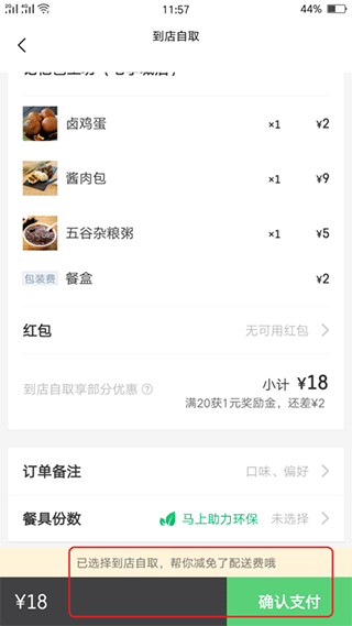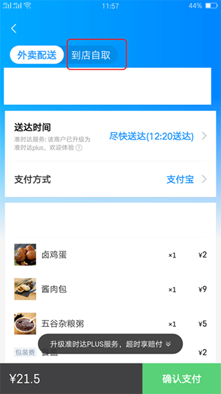 三、进入商户点好餐进入结算界面后,找到页面顶部的”到店自取“一项,点击进入。