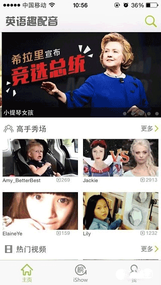 2、进入界面后可以先选择”高手秀场“和“排行榜”里面的视频听听用户上传的配音视频。也可以选择热门视频里的视频进行观看。