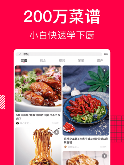 100人的美食团队,数十万美食家共同贡献了超过50万道精选菜谱。在这里,不仅有简单易学的家常菜,更有精品专业的烘焙秘方,无论你想学习川菜、湘菜、粤菜、素菜、凉菜、煲汤,还是想做蛋糕、面包、披萨、西餐,各式各样席卷而来的美味做法,让你目不暇接爱不释手。