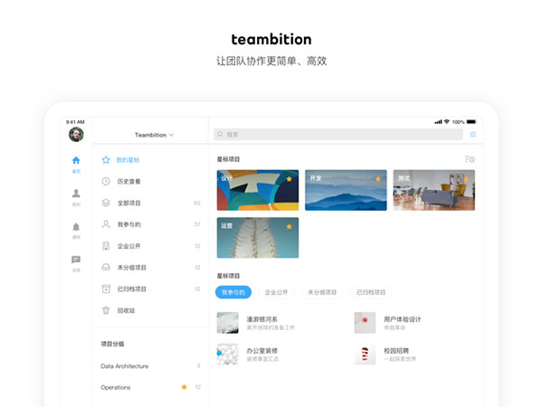 teambition ipad版是专为苹果ipad设备而开发的一款团队协作软件,拥有任务管理、分享讨论、文件共享、日程安排、账目记录、每日动态、标签等功能,是目前最优秀的一个简单,高效的项目协作工具,让用户可以在这里管理项目,跟踪任务进度,存储项目文件,让你的团队协作更高效。