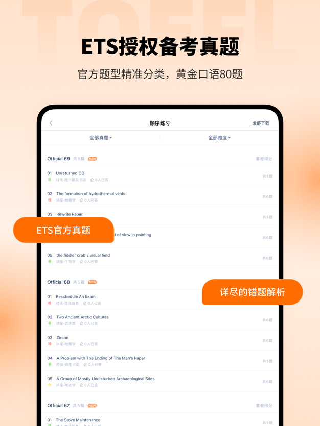 小站托福与ETS官方合作,拥有正版授权的TOEFL历年真题资源(包括但不限于Official 1-71套历年备考真题,个别缺失除外),托福口语、听力、写作、阅读、单词贴近真实考试的全科模拟练习,让您的每一次刷题都犹如实战演练。