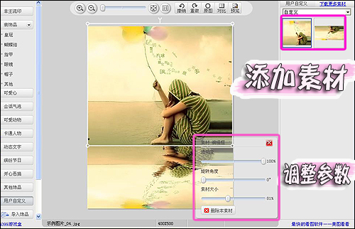 5、然后进入“饰品”菜单下,将原图和倒影的图片导入到“用户自定义”中。如图7所示。