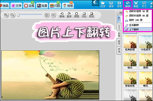 2、选择界面右上角的“旋转”功能,点击“上下翻转”就可以了!如图4所示。