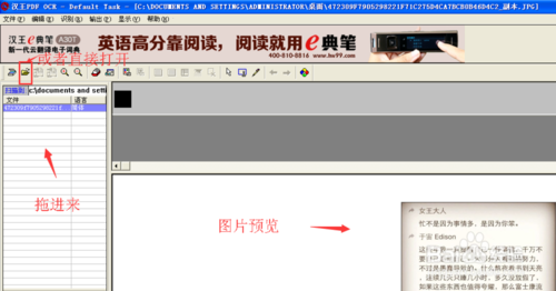把需要转化的图片拖进汉王ocr左侧窗口中(或者用打开的方式也可以),左侧是所有图片列表,右侧是选中图片的预览图。