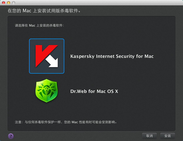 3、选定您想要安装的病毒防护程序,Kaspersky Internet Security for Mac 或 Dr.Web for Mac OS X,点击安装,并根据屏幕的说明操作。