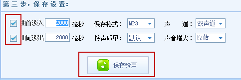3、截取歌曲完毕后注意第三部,这里勾选可以让你的铃声不会很突兀,所以最好选中,然后点击保存铃声即可。