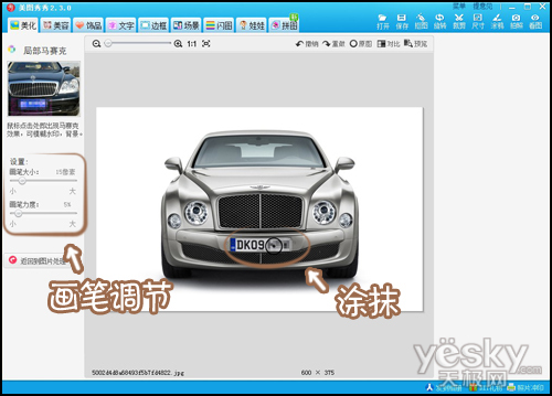 现在在左边调节适当的画笔大小和力度,然后在需要被马赛克的部分涂抹即可,如下图涂抹车牌一样。
