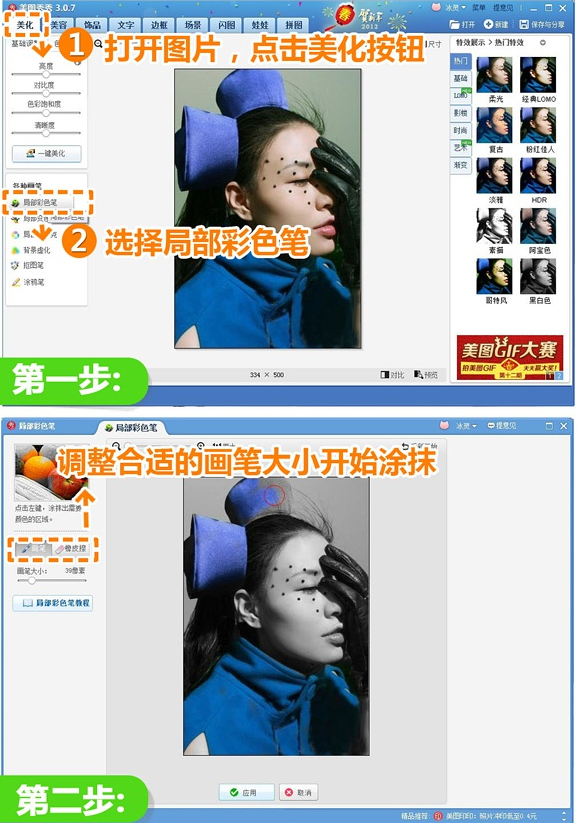 美图秀秀是当今最常用的照片修改工具之一。那么关于现在很流行局部彩色的照片,因为局部的色彩会让你的照片拥有一种唯美的艺术感,今天教大家用美图秀秀就简单很多啦!具体怎么操作想必现在很多网友们都很想知道吧。不要着急,接下来,东坡小编就来给大家介绍一下关于美图秀秀2015局部彩色笔有什么作用 局部彩色笔使用方法大家可以参考一下。