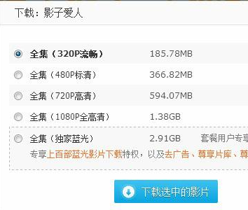 4、之后会弹出选择洗下载的分辨率大小,分辨率越大占用的空间越大,但是清晰度越高。所以如果内存多的话可以选择“蓝光1080P”即可。点击“下载选中的影片”。如图所示: