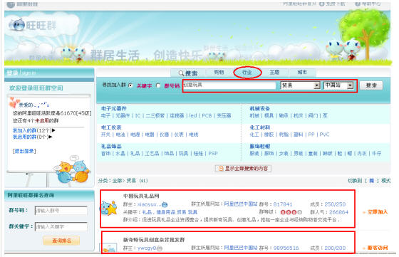 8、点击查找后,打开进入新的"旺旺群"的页面,其中有关创意玩具的旺旺群,就会展示在面前。浏览或加入相关感兴趣的群,进一步了解供应商的信息,并可以进一步与他们进行选择性的洽谈。