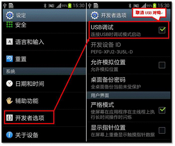 二、取消【USB调试】的对钩。
