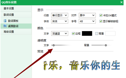 5、完成以上操作,便出现QQ音乐的桌面歌词设置界面,用户可以选择更改桌面歌词的文字和背景透明度来设置桌面歌词对于视觉方面的影响。