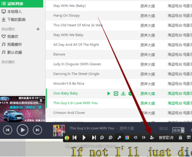 4、将鼠标放在歌词上,便出现了桌面歌词的菜单项,选择一个小人和一把扳手的图标。点击它