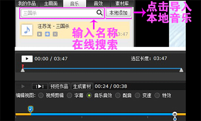 点击【音乐】的“本地添加”导入音乐,右边时间轴上面定位好游标,将导入的音乐拖到右边编辑界面,同时弹出一个音乐编辑框。在弹出的“音乐编辑框”内,移动时间轴的两个头标,选择想要添加的音乐区间,点击“完成”即添加。插入多首音乐的步骤相同。拖动时间轴上的按钮可调整音乐的播放时长。