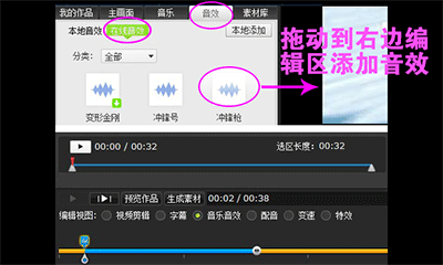 点击【音效】栏的在线音效,右边时间轴定位好游标,选择喜欢的音效拖动到右边编辑区域,同时弹出一个音效编辑框。在弹出的【音效编辑】框内,移动时间轴的两个头标选择想要添加的音效区间,点击“完成”即添加。插入多首音效的步骤相同。拖动时间轴上的按钮可调整音乐的播放时长。