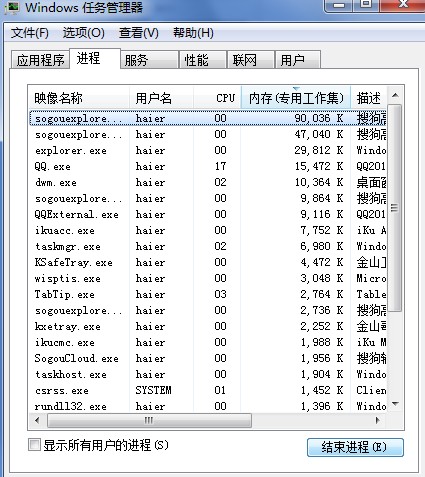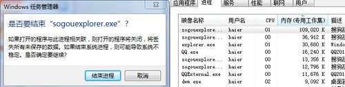 3、这个时候,选择此时占内存最大的那个“sogouexplorer“