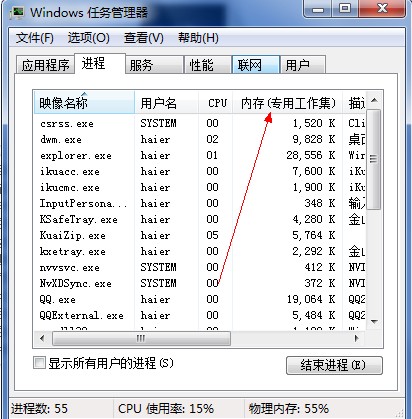 2、点两下“内存(专用工作集)”就可以进行排序啦!