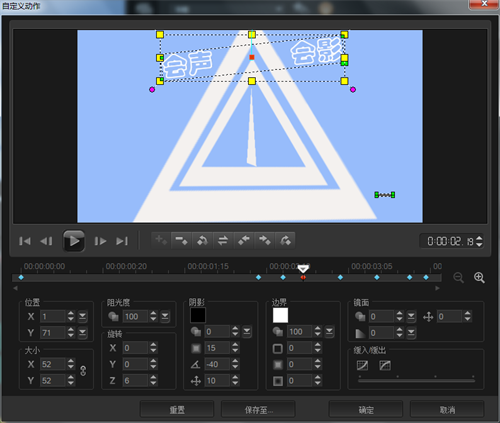 6、选中透明素材,右击鼠标,选择“自定义动作”,在第一点将素材拖至界面外,最后一帧同样将素材拖到界面之外,中间再插入几个关键帧,并修改其大小与方向,设置好以后另存为一个子文件。