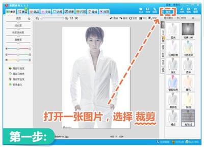 第一步:在“美图秀秀”软件下打开韩庚同学的图片,选择软件界面右上角“剪裁”功能。