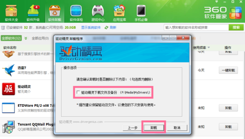 如果你不想保存驱动精灵下载文件及备份可以勾选它想保存就不要勾选再点击《卸载》,这样就卸载完成了。
