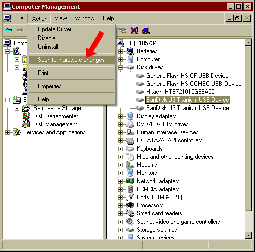 2. 打开菜单,点击操作然後选择扫描硬件改动。