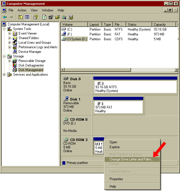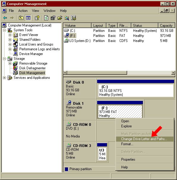 2. 在Cruzer闪存盘相关的盘符,右击并选择更改盘符名字和路径。(在下面的示例图片,您只能看到磁盘1)