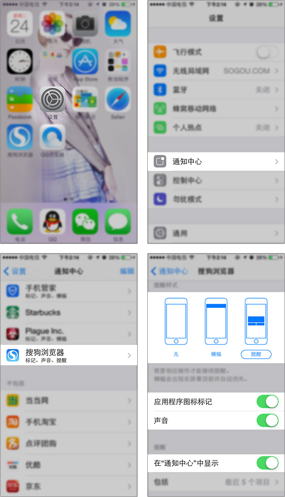 针对iPhone:进入手机“设置”,点击“通知”,进入通知中心,找到“搜狗浏览器”,打开图中的四个选项。倘若打开通知中心后没有及时收到消息通知,可能是苹果推送服务延迟造成的,请耐心等待。