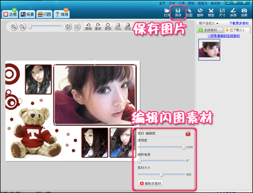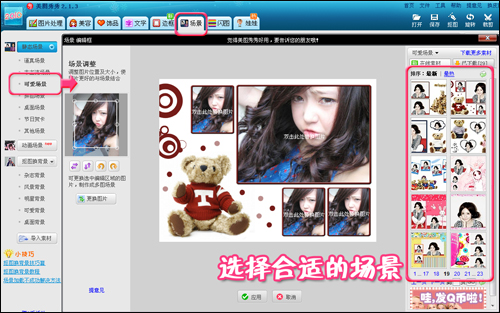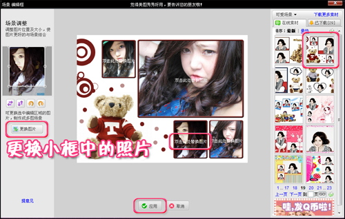 通过“更换照片”或双击照片的方式来更换场景小框中的照片,更换好后单击“应用”。