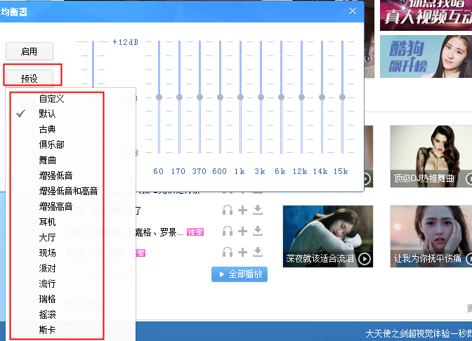第二步:如果用户不知道怎么调整均衡器,其实软件有预先调好了的几种类别。大家可以选择。