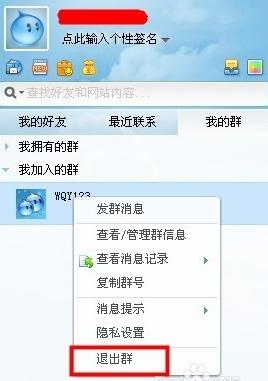3、右键点击“退出群”