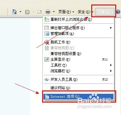 1、打开IE,点击工具栏的“工具”,并选择 “Internet选项"。