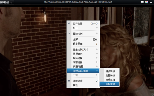 3、在播放的视频中点击右键菜单,选择右键菜单中的视频截取,在里面选择片段截取