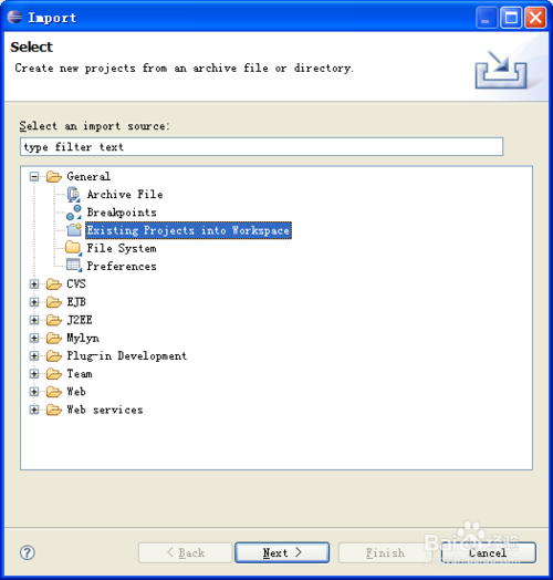 2、进入导入界面,选择General下的Exiting Project into Workspace。