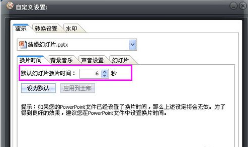 给幻灯片加“切片时间”:选择“换片时间”→设置默认幻灯片时间为“6”秒(可自定义调节),这样幻灯片播放的时候就会按照这个时间自动播放(ppt如何自动播放)了: