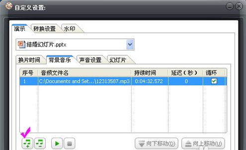 6、“自定义”设置,给结婚照幻灯片添加背景音乐:单击“自定义”按钮→“演示”→“背景音乐”中“”按钮添加音乐歌曲,如果之前自己在制作幻灯片的时候已经添加了音乐(ppt怎样添加背景音乐),这一步就可以不操作。
