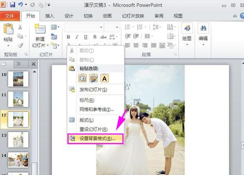 2、插入后可能会发现有些结婚照片出现左右上下四周出现空白处,这时候我们需要填充一个幻灯片背景,ppt如何设置背景呢?简单操作:鼠标右键单击幻灯片空白处,在右侧的快捷菜单中选择“设置背景格式”: