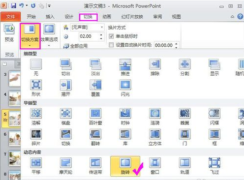 3、背景有了,幻灯片也不能太死气沉沉,制作PPT动画效果:选中幻灯片,单击菜单项“切换”选项卡→在“切换方案”中选择切换效果,切换效果分为三大类:细微型、华丽型、动态内容。小编本次结婚照幻灯片所用比较多的是“动态内容”效果,童鞋们尝试就知道啦,记得每个幻灯片都用同样的操作步骤应用不同的切换效果哦!