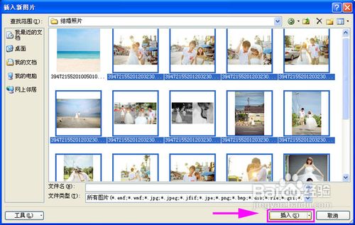 找到存放结婚照片的存放位置,然后点击一张照片,敲击键盘“Ctrl+A”全选照片,然后单击“插入”按钮,之后回到“相册”窗口中单击“创建”按钮: