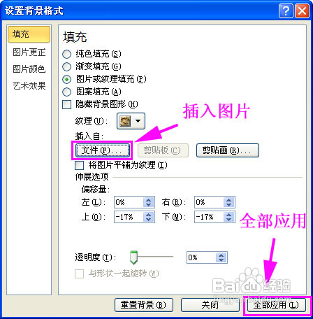 “设置背景格式”中选择“填充”选项→找到“图片或纹理填充”→单击插入自“文件”按钮→选择适当的图片作为插入→回到“设置背景格式”窗口单击“全部应用”按钮: